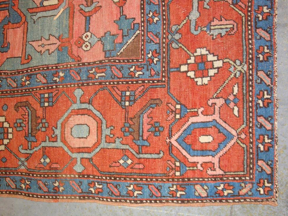 The beautiful age-old colors in this rare Serapi rug are matched only by its free artistic design and charming motifs. A salmon-red medallion with a diamond-like structure and blue center lays within a bright ivory field that extends to an exquisite rosé outer area and azure-blue corners. Lovely primitive renditions of branches, flowers and leaves adorn the rug and delightful border.