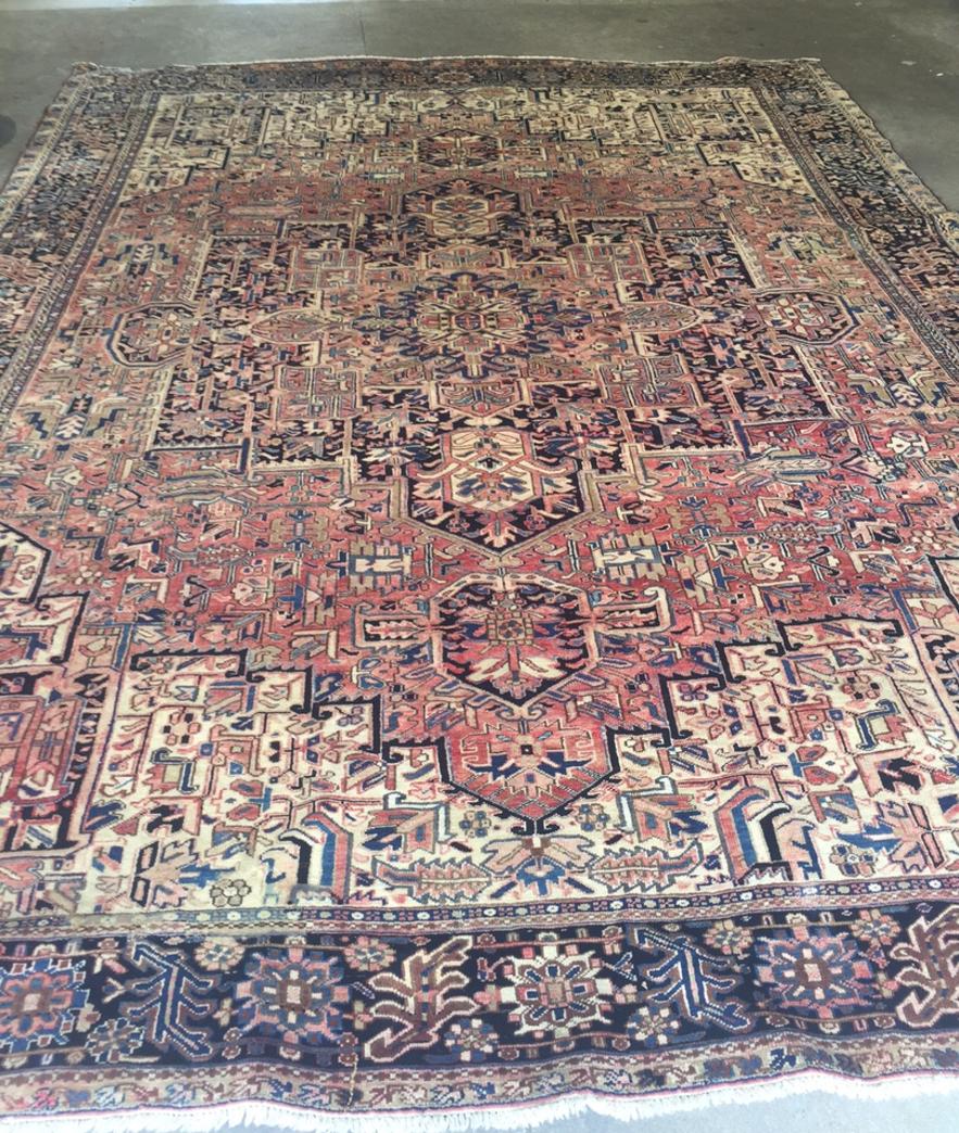 A stately rug with an imposing square-shaped central medallion laid within a red field contrasted against bright ivory corners and an indigo border. Closer examination reveals the intricacy of the medallion. It comprises an ivory and light blue "sunburst" at the center of a salmon-red eight-lobed medallion reminiscent of star Ushaks, and a grand deep blue outer medallion with sculpted sides that rise in steps towards turrets in the middle, a pattern that is echoed in the sides of the red field. Beautifully aged colors, including rare chestnut brown and olive green, gorgeous wool, and a wealth of foliate motifs complement the composition. (The pics were not taken in good light and do not show the colors well.)